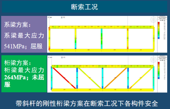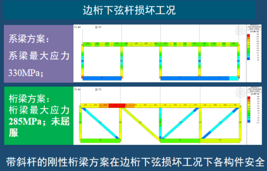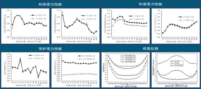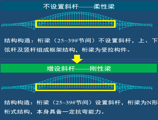 3.刚性拱刚性梁体系:关键节间增设斜杆,中跨拱圈下弦内力减小近10%,抗风险能力增强,行车竖向加速度降低。