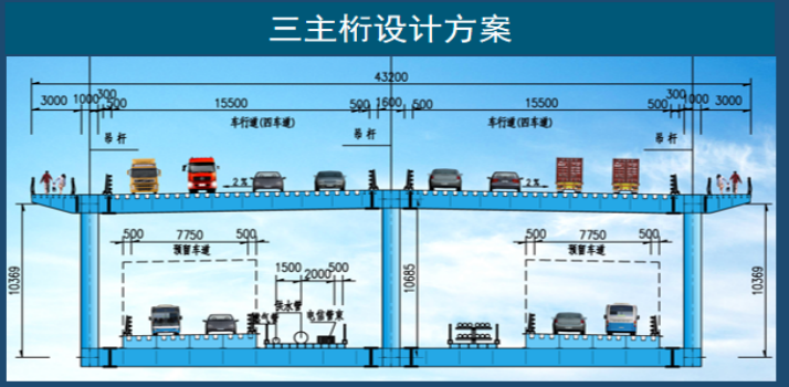 1. 三主桁设计方案:适配43.2m宽桥面、12车道需求,兼顾结构紧凑性与景观协调性,为同类桥梁提供差异化解决方案。